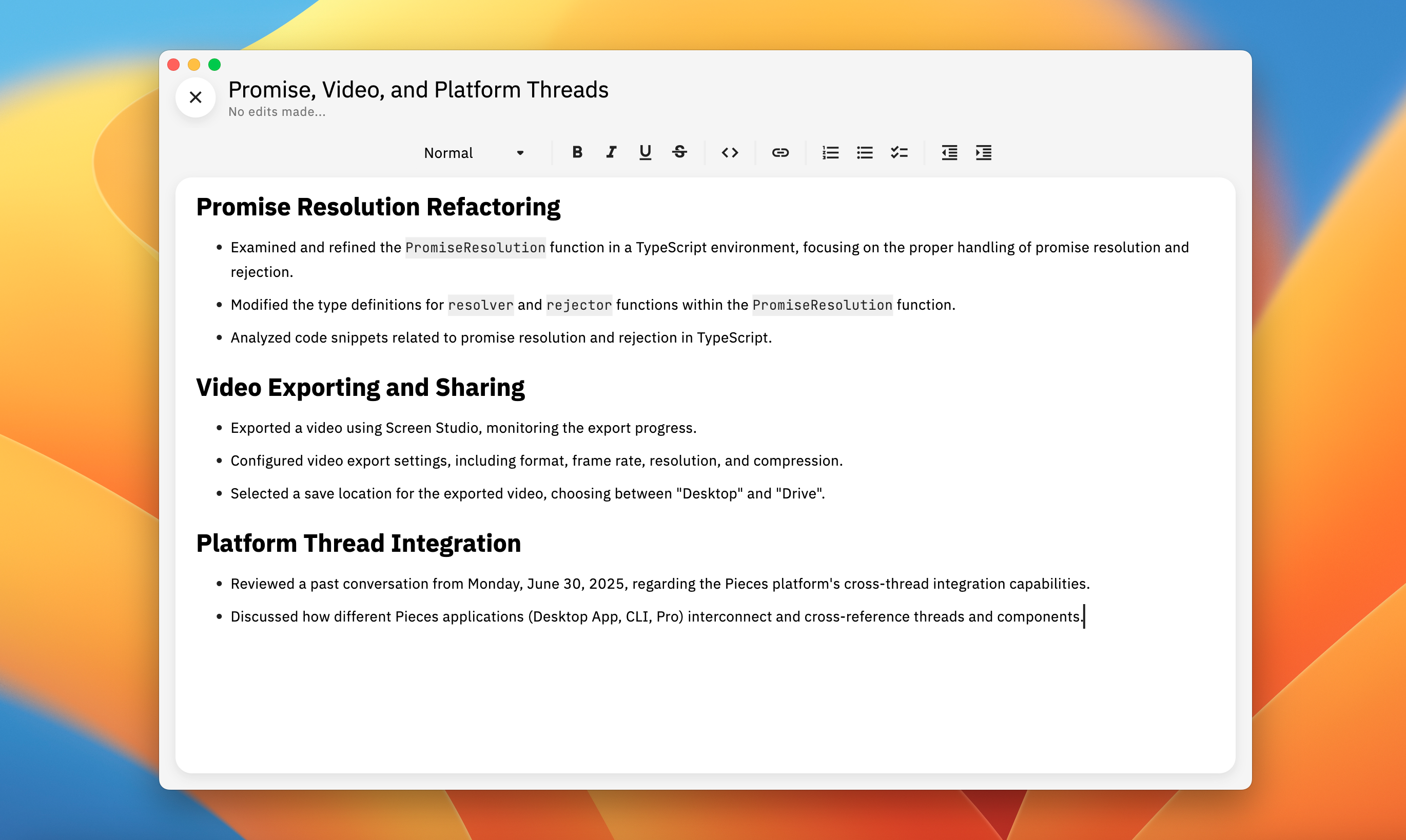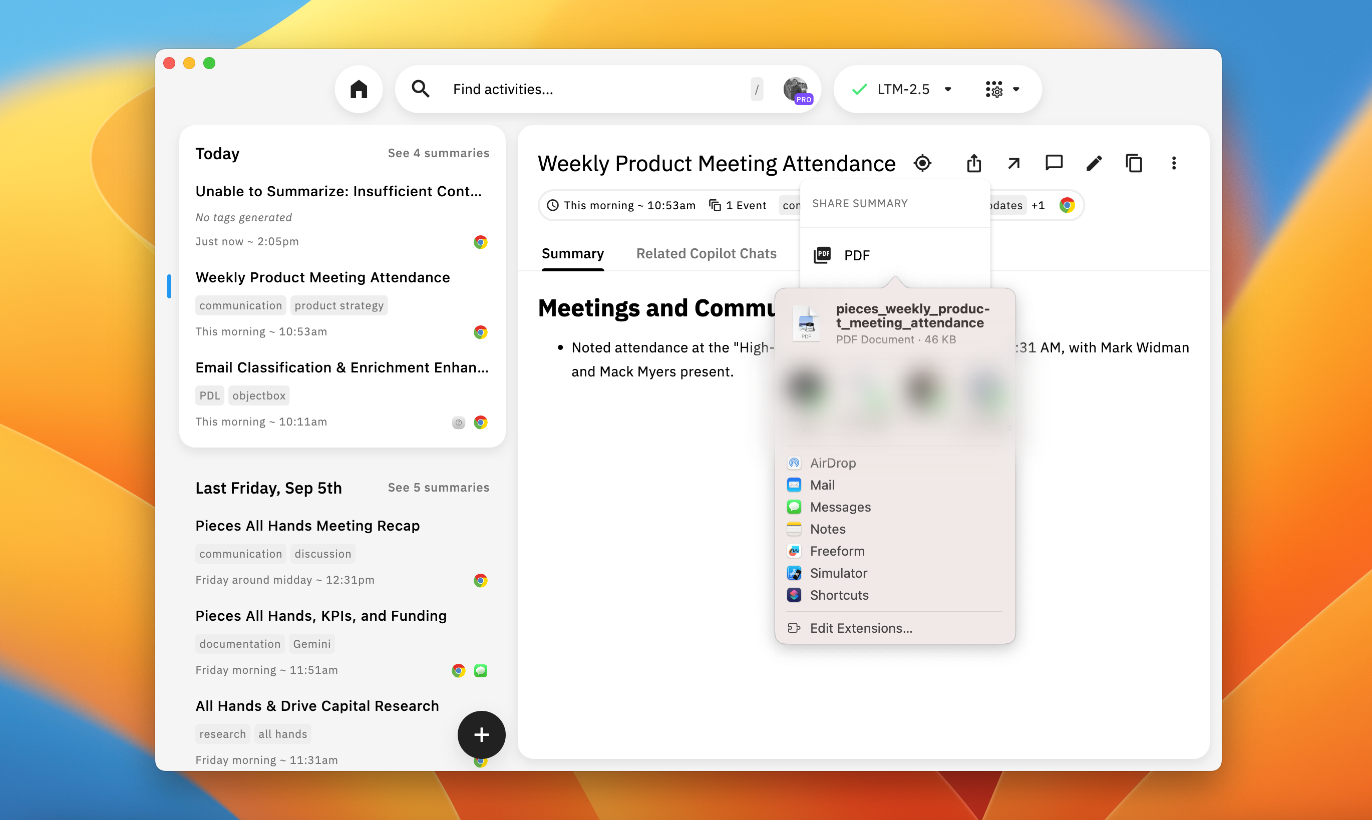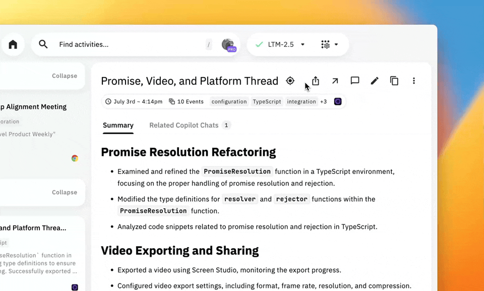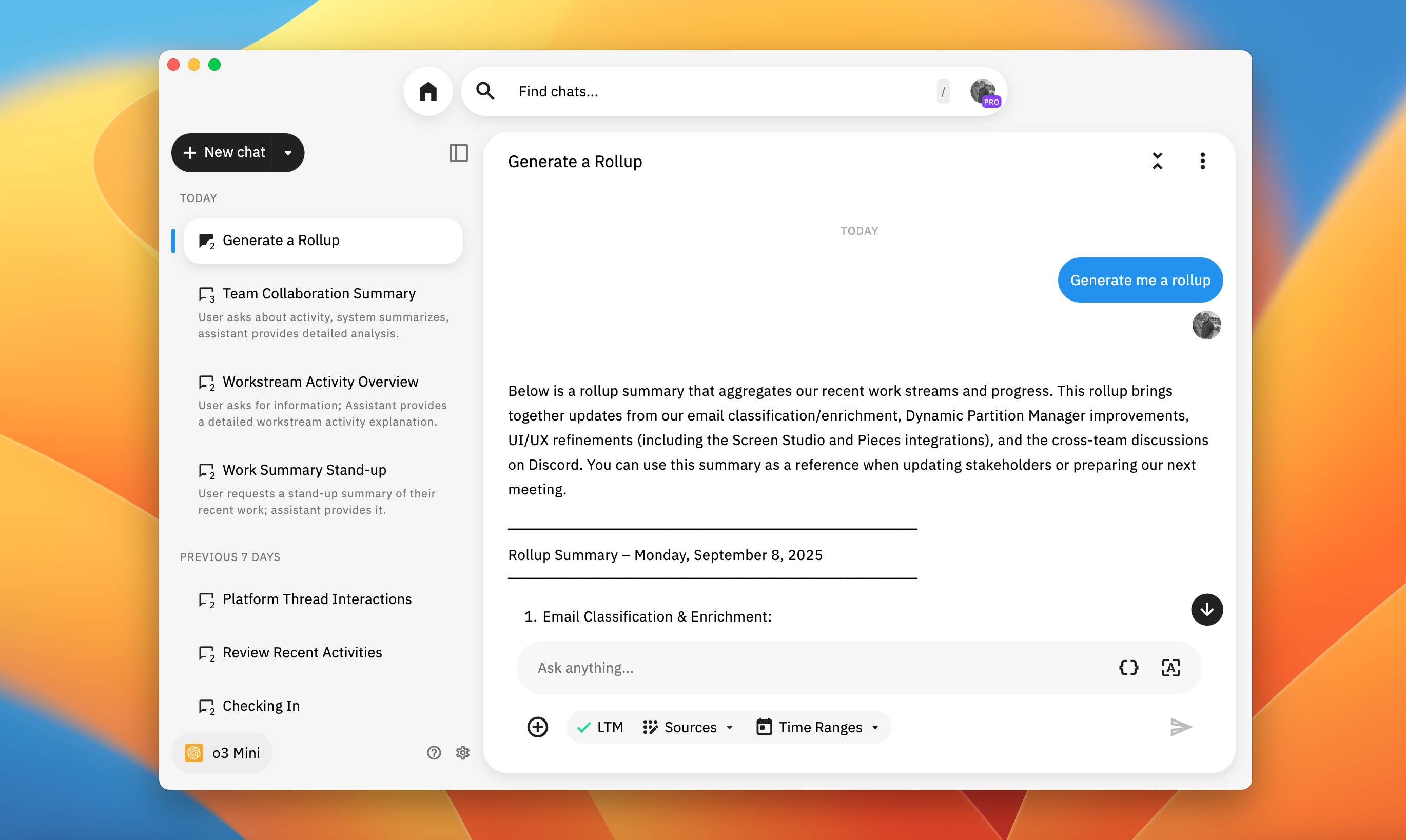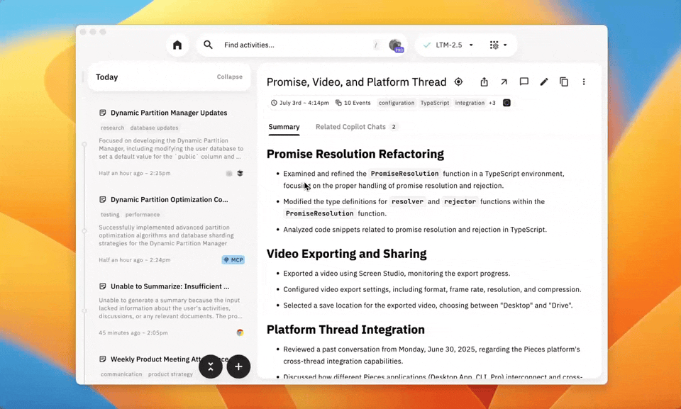 : Immediately open a Pieces Copilot Chat session scoped to that roll-up’s context; the summary is used as context right away so you don’t need to restate anything.Export