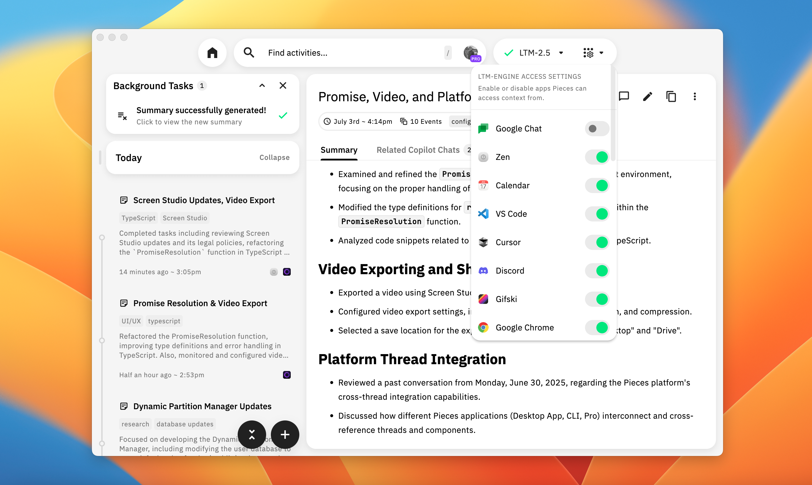 At any time, even after a summary has been generated, you can disable sources from which LTM captures workflow data. Since LTM is available for use outside of the Pieces Desktop App, there are two locations from which you can make these changes.