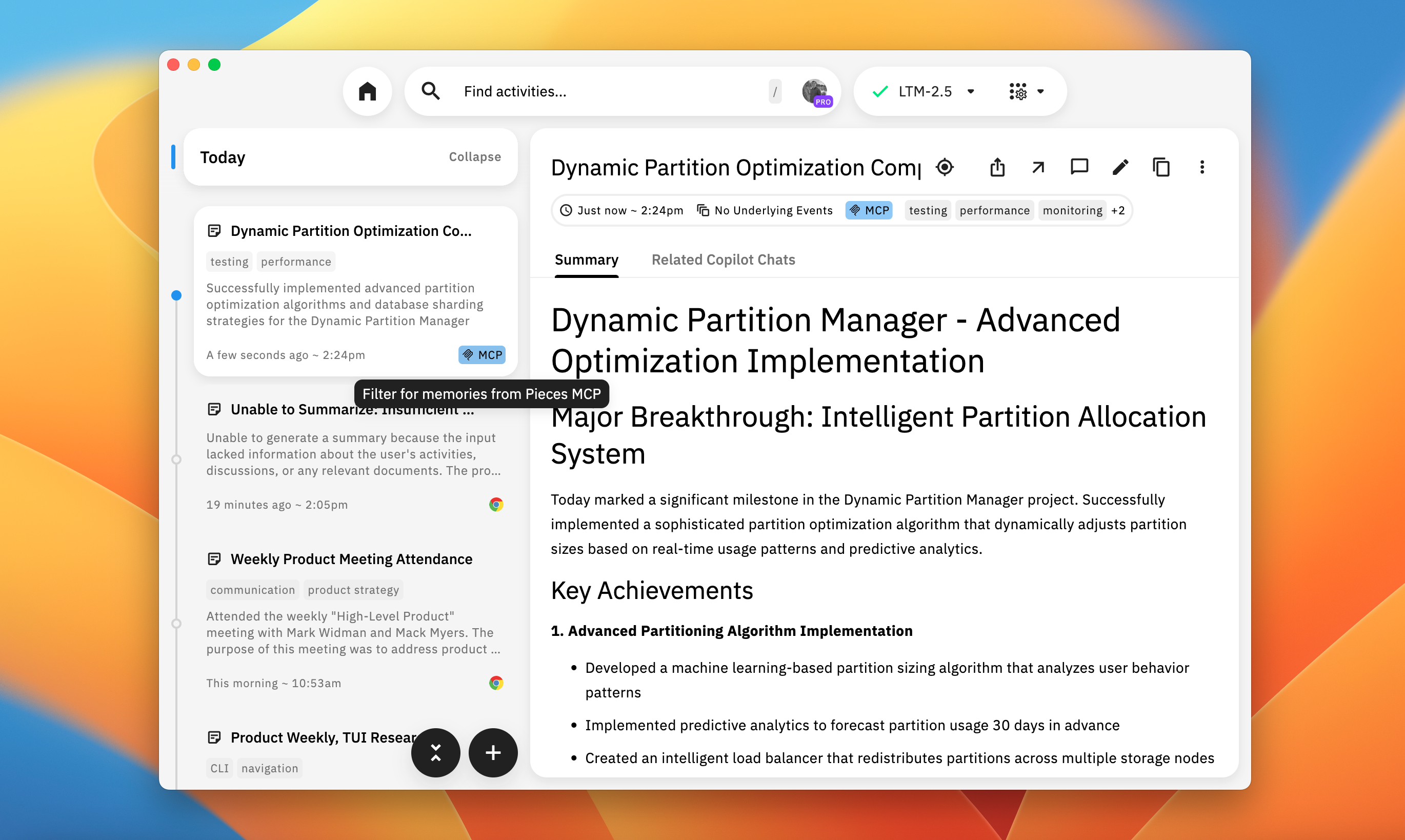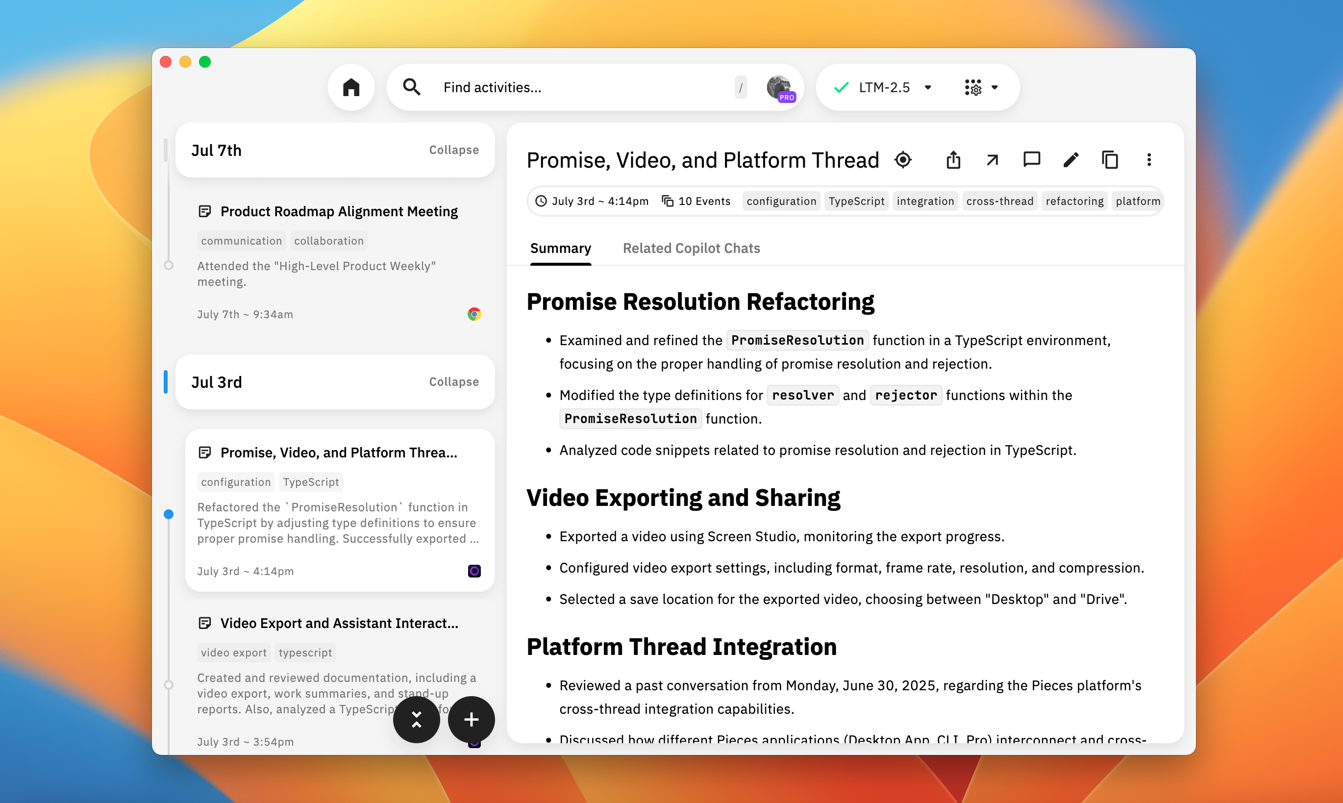 The Workstream Activity view in the Pieces Desktop App integrates with the new-and-improved Long-Term Memory Engine (LTM-2.7) to capture and summarize your recent tasks, discussions, code reviews, and more.