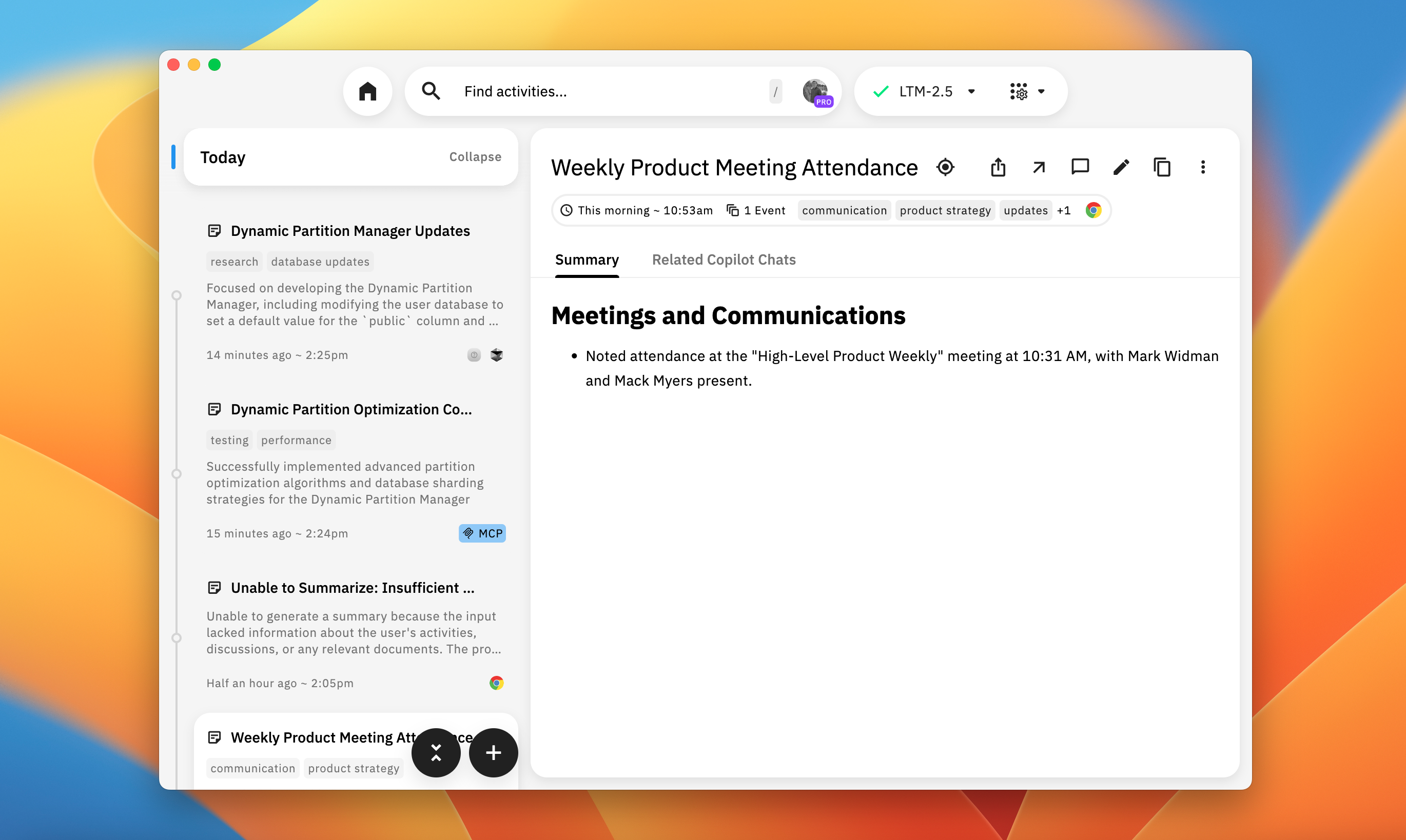 Activity Sidebar (Left Panel): A chronological list of your LTM roll-ups. Each roll-up is timestamped (e.g., “9:04 AM – 9:14 AM”) with a descriptive title (such as “Documentation & LTM-2.7 Prep”).