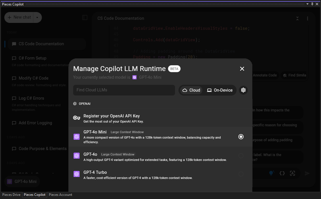 This flexibility allows you to tailor Pieces Copilot to your specific development needs, whether it’s speed or accuracy.
