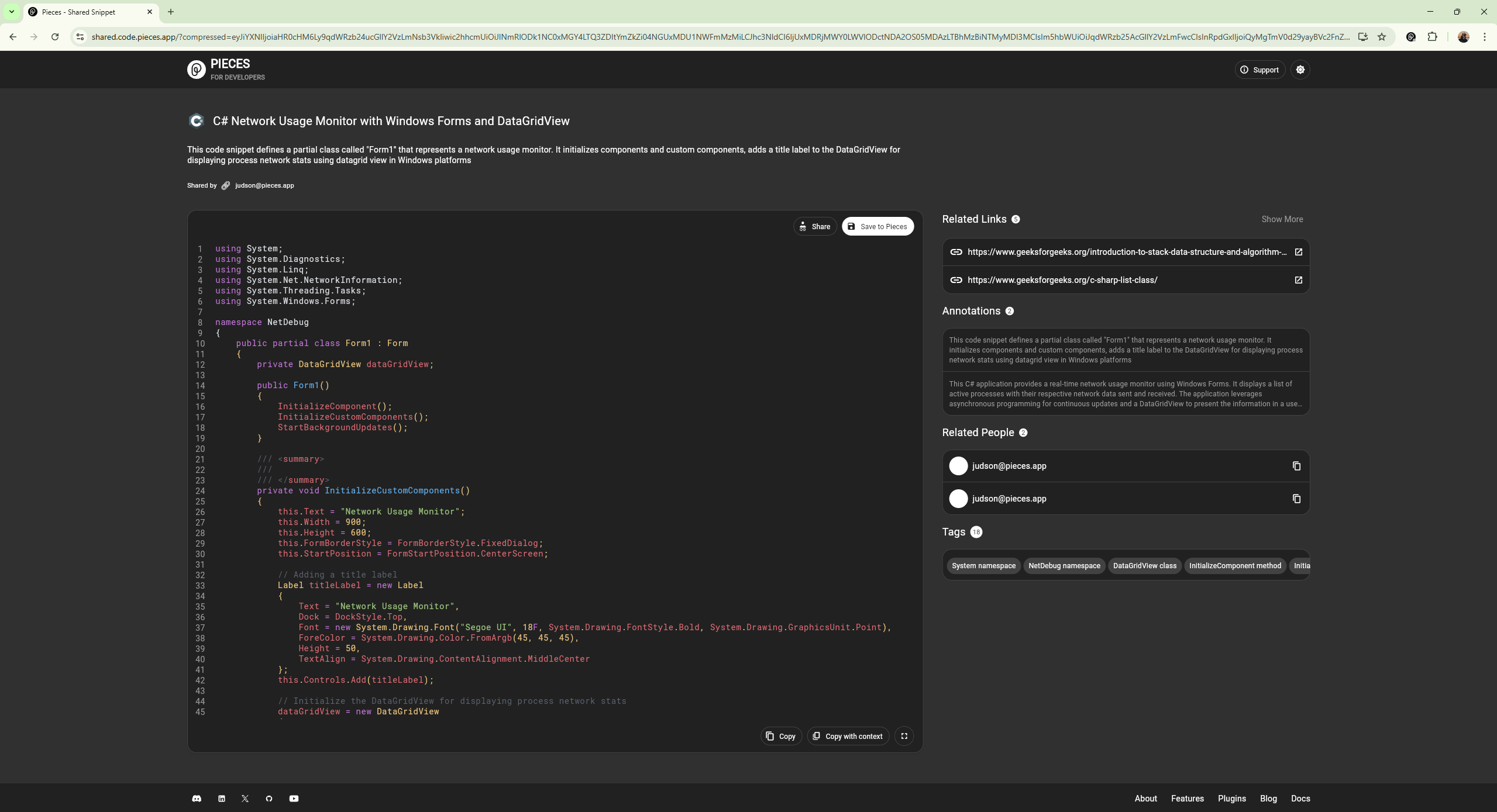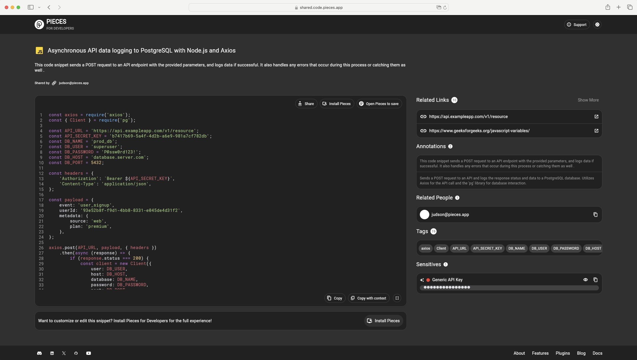 When a snippet is saved to the Pieces Cloud, the code is enriched with valuable information such as related people, links, annotations, tags, and an automatically-generated description.