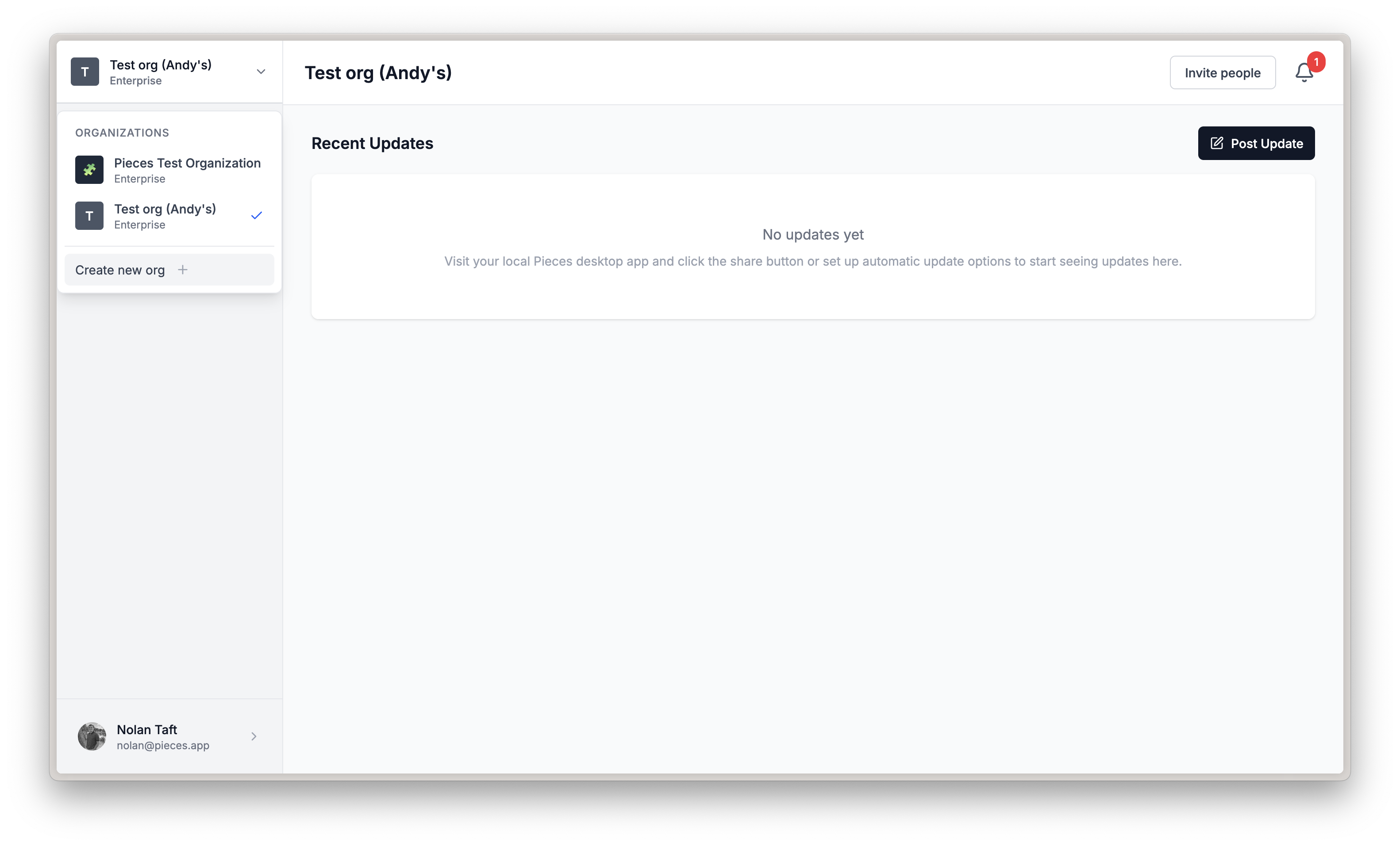 Organization overview page showing updates, members, teams, billing, and settings options
